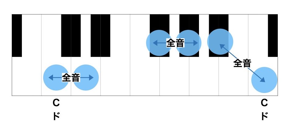 上記の矢印で繋いだ青丸同士の鍵盤は全音です。