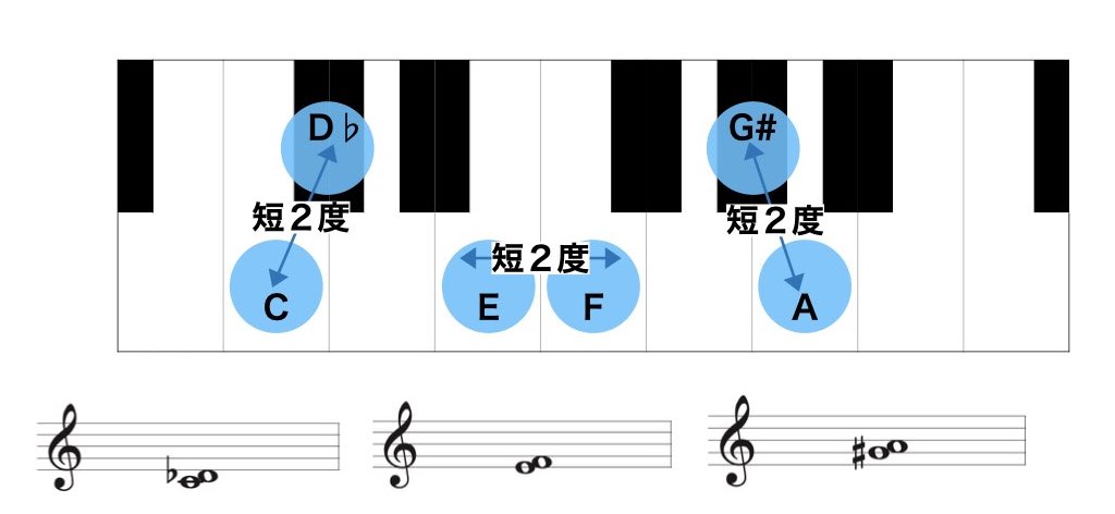 - 短2度は2度の音程で、半音と同じ間隔になります。