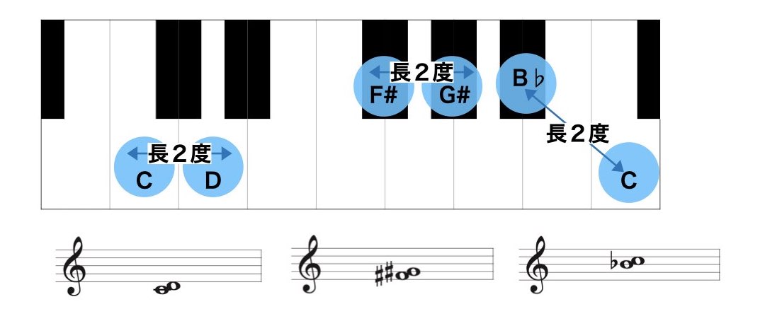 - 全音は英語ではホール・ステップ(whole step)と言い、半音2つ分の間隔のことです。