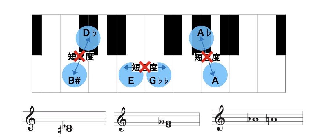 - E(ミ)とG♭♭(ソ♭♭)は短2度ではなく重減3度