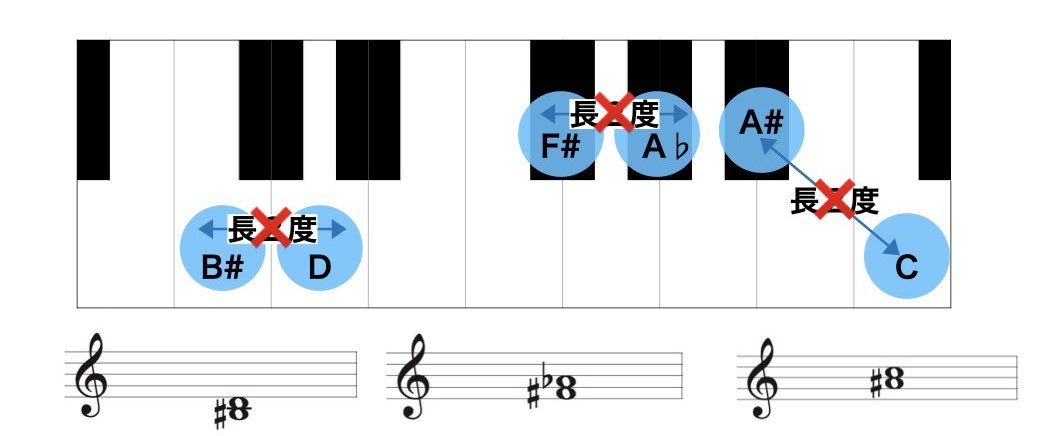 - A#(ラ#)とC(ド)は長2度ではなく減3度