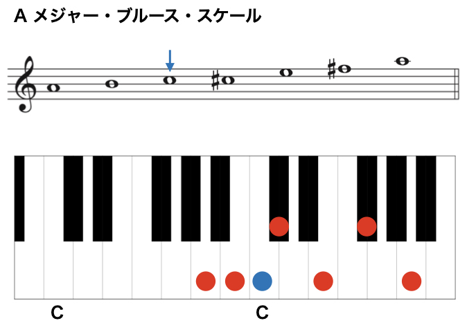 C# と Db メジャー・ブルース・スケールは、異名同音のため鍵盤では同じ音になります。