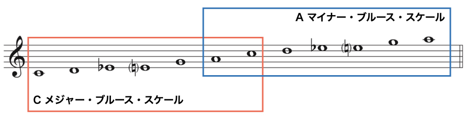 つまり、Cメジャー・ブルース・スケールと Aマイナー・ブルース・スケールは同じ音で並びが違うということになります。