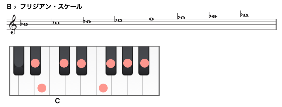 メジャー・スケールの第2音、第3音、第6音と第7音を半音下げると、フリジアン・スケールになります。