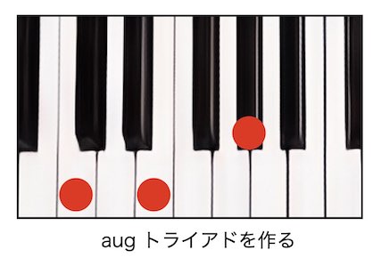 グレーの小さい丸 ● は augトライアド(3和音)の上に1音足した時に間に入る鍵盤を示しています。
