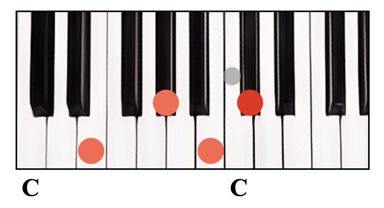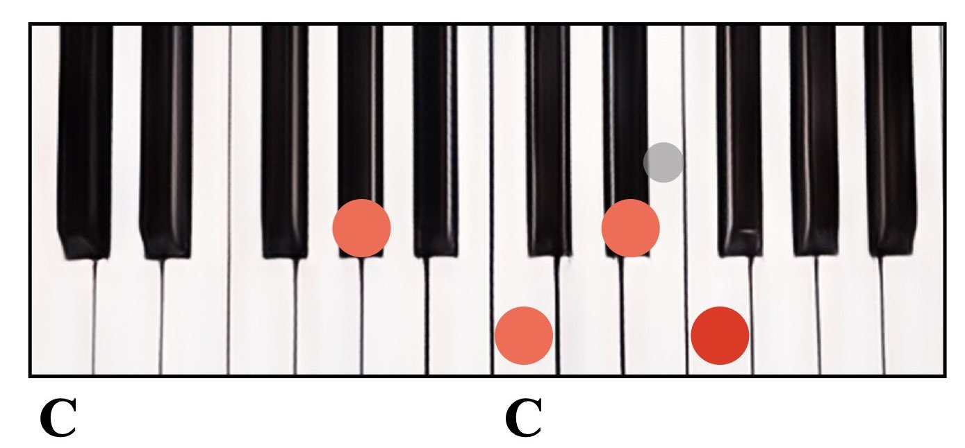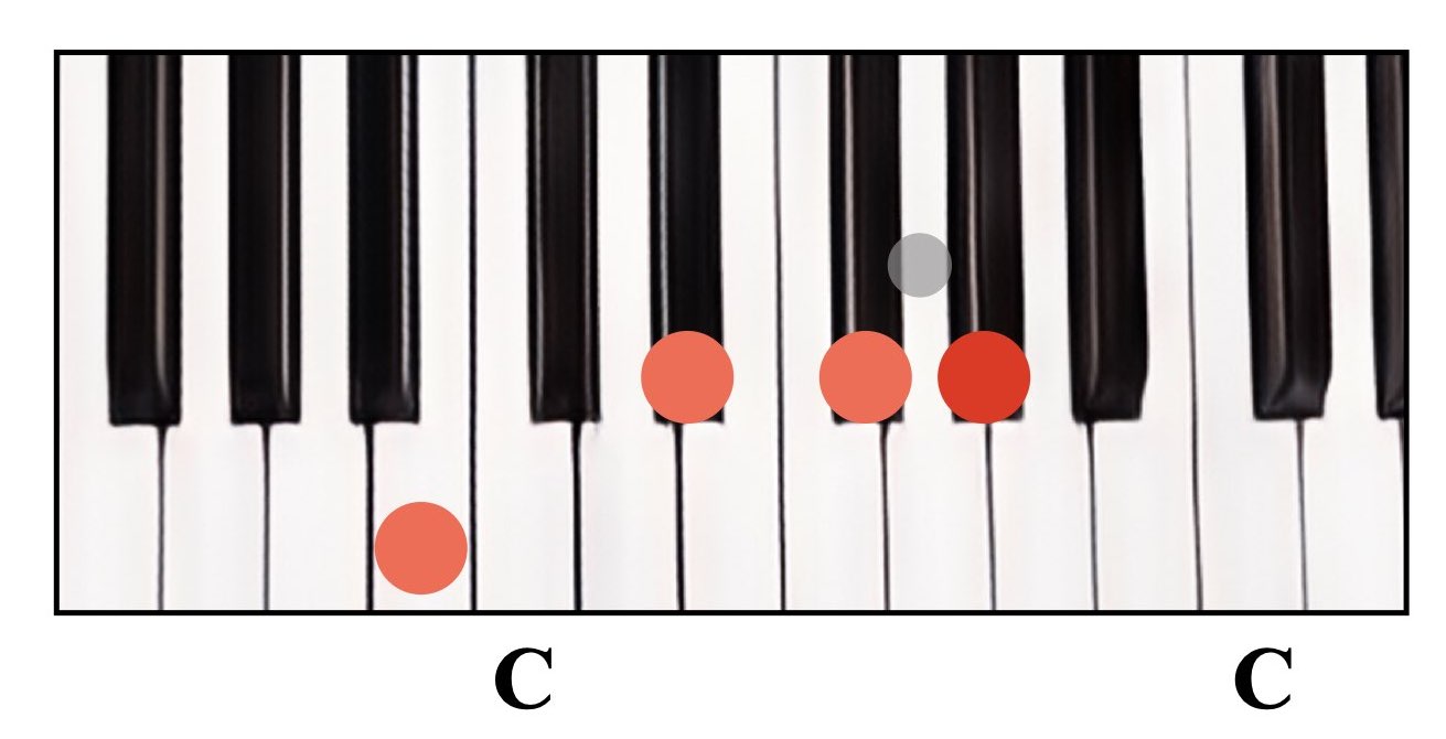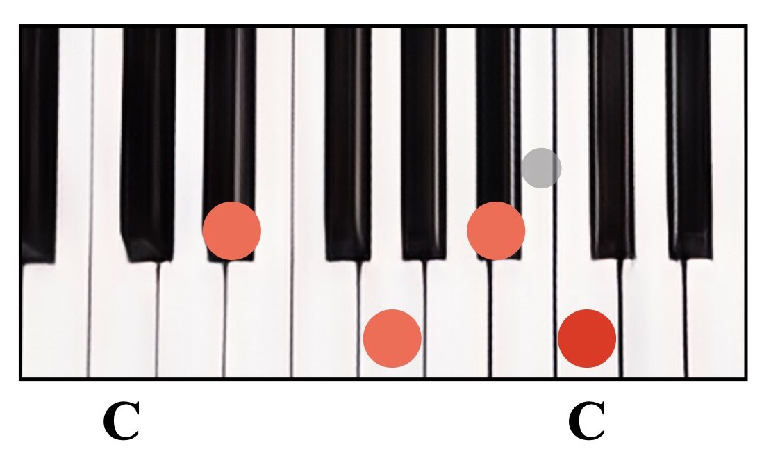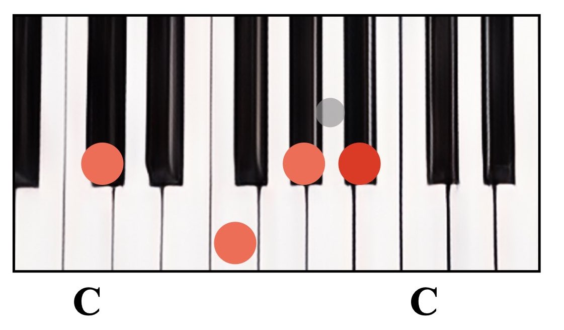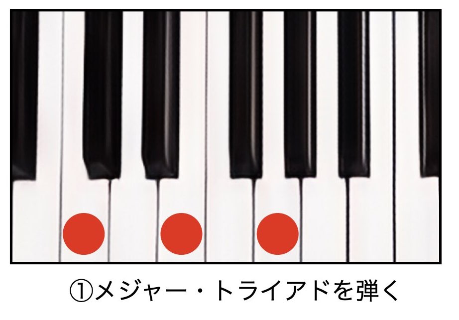 - メジャー・トライアドの1番上(右)の音から2つ鍵盤を進める。(間に1つ鍵盤が入っている状態)