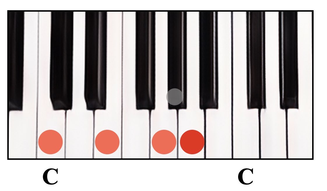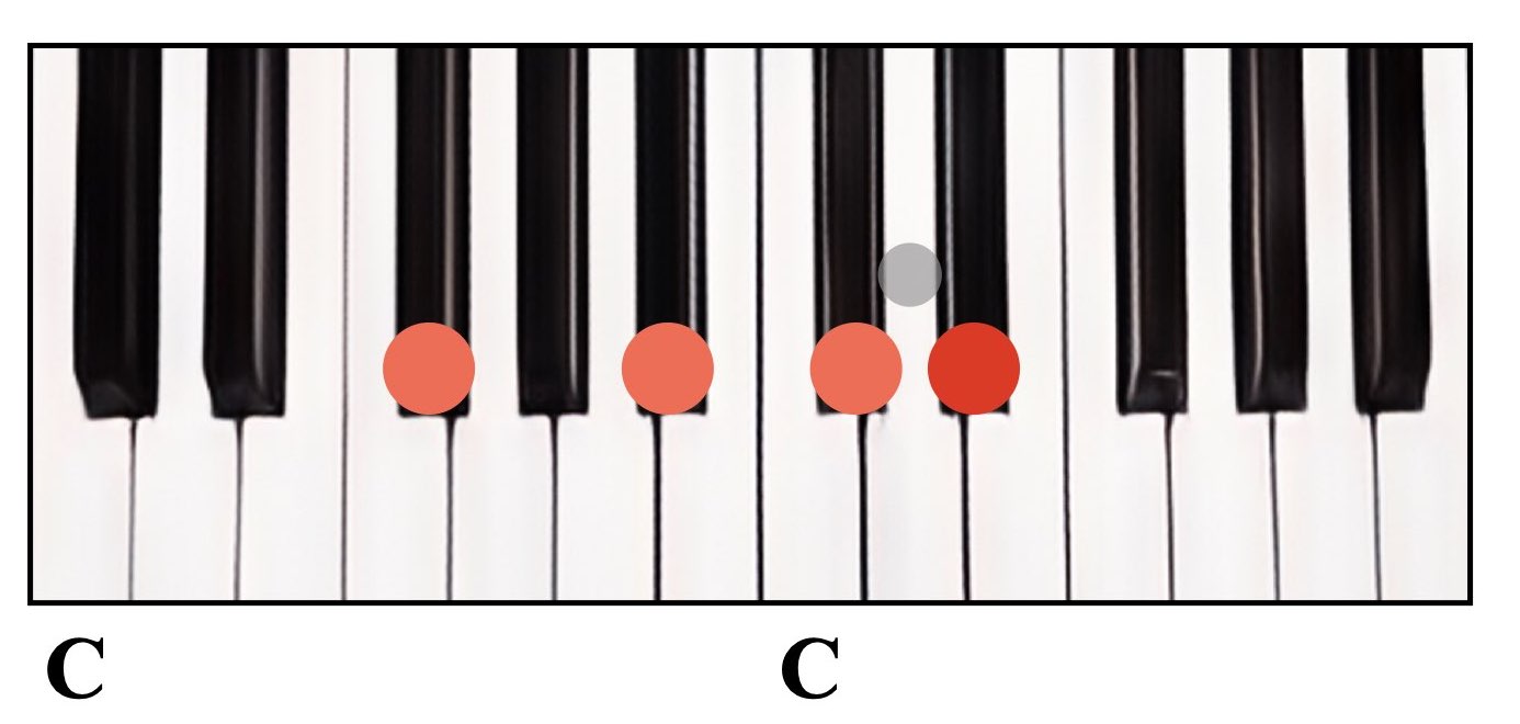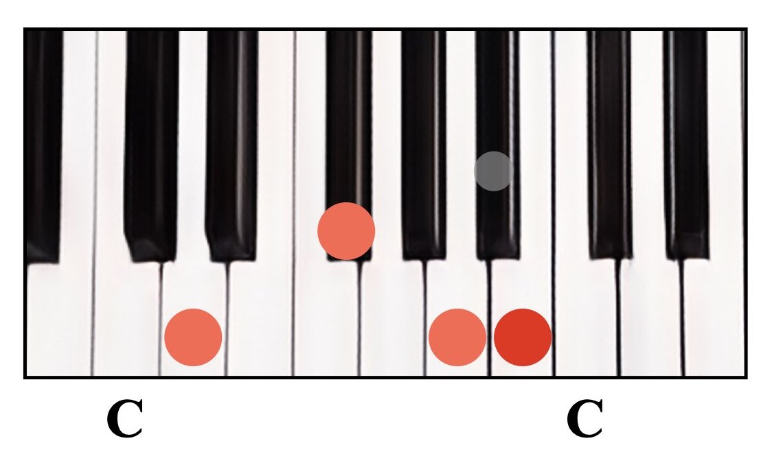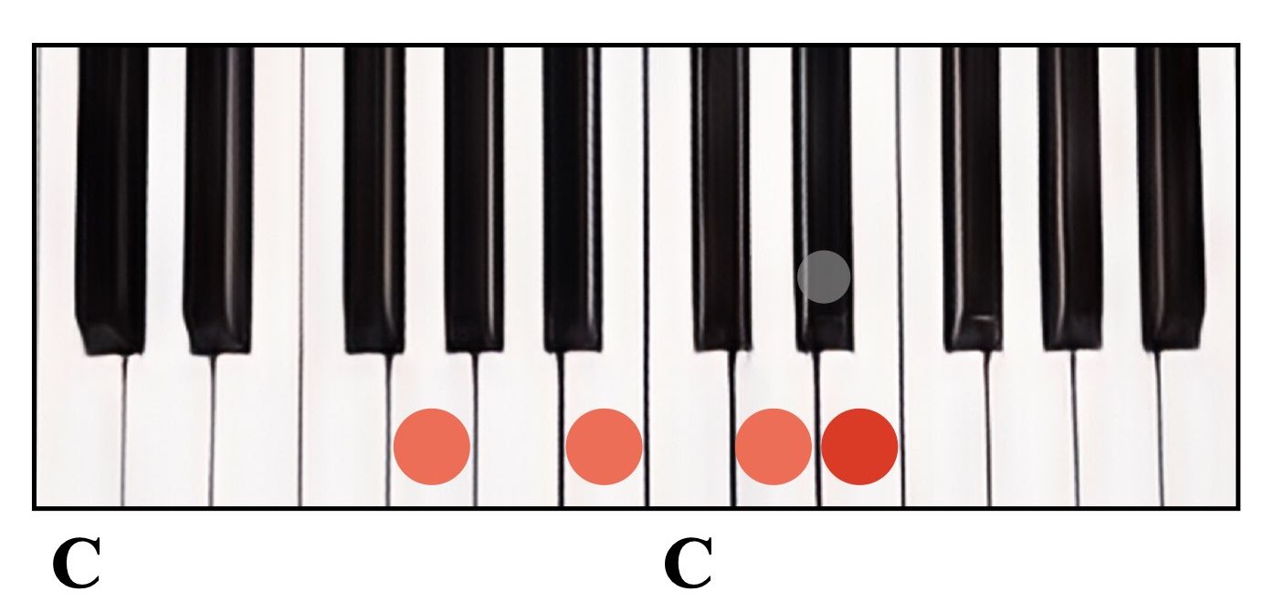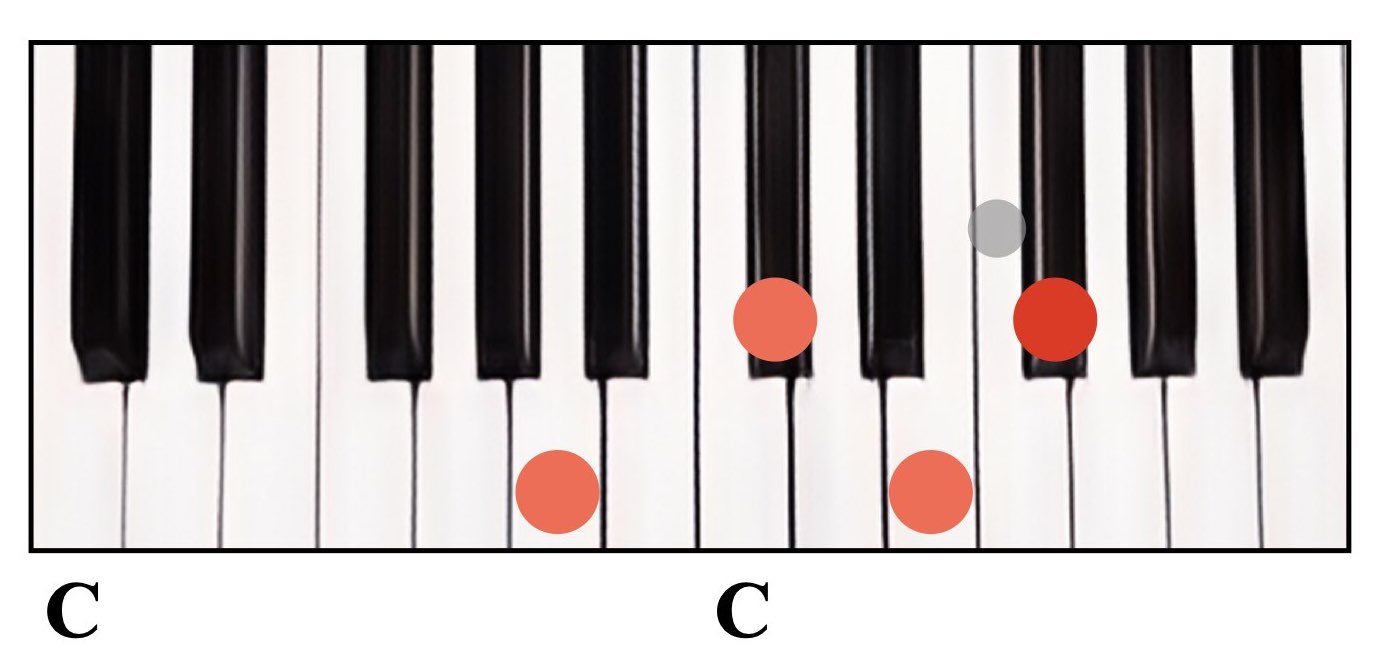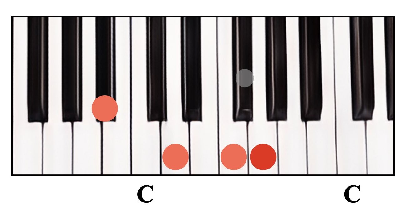 - メジャー・トライアドの1番上(右)の音から2つ鍵盤を進める。(間に1つ鍵盤が入っている状態)