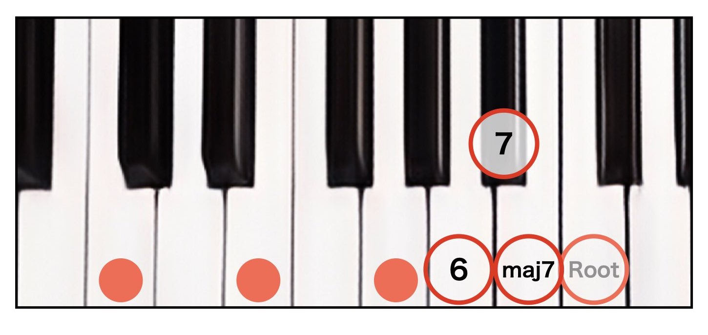 薄い赤丸 ● がメジャー・トライアド、赤丸 ● が 6thの音です。