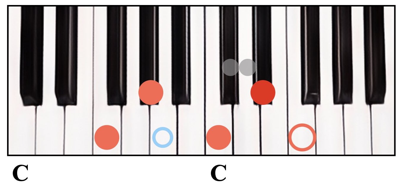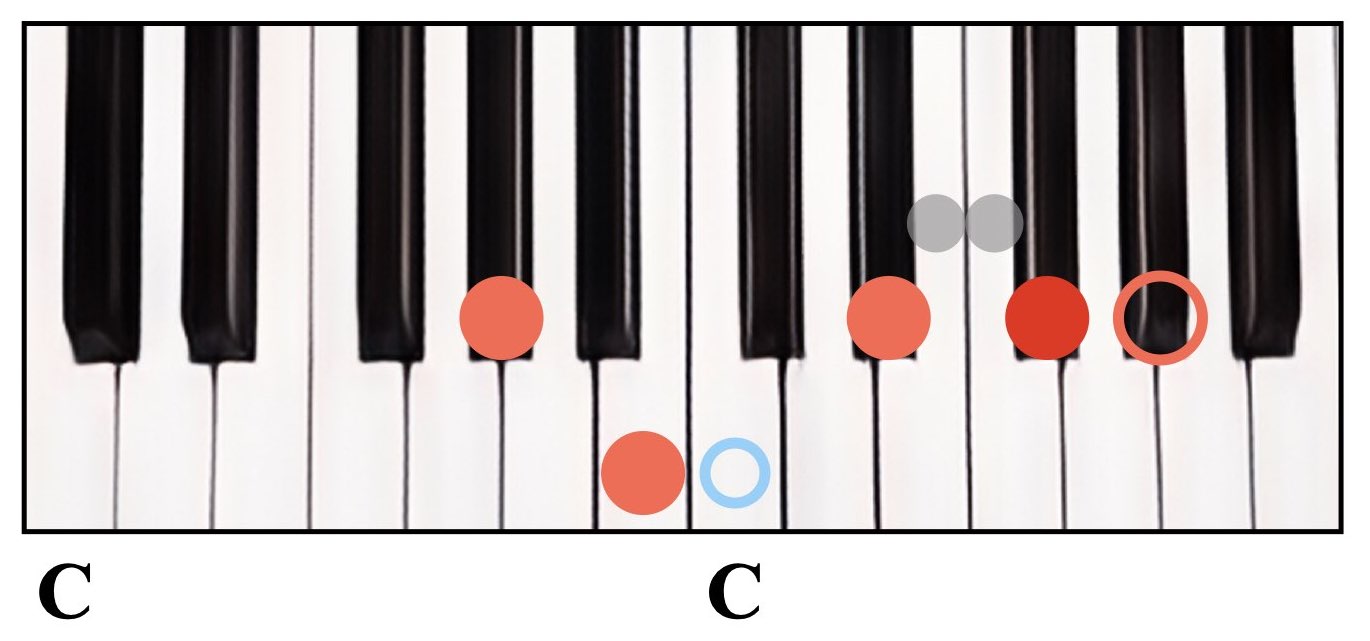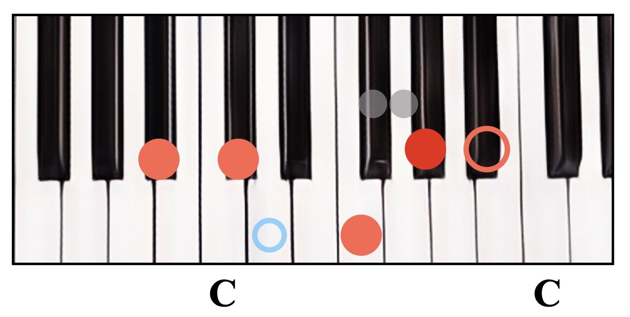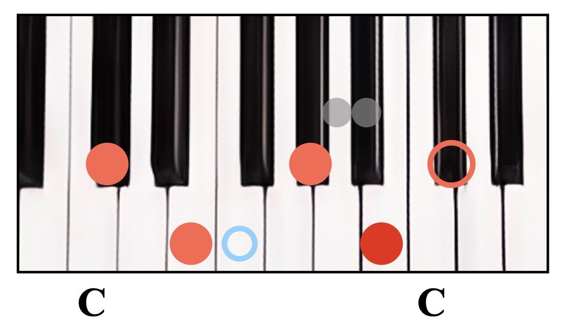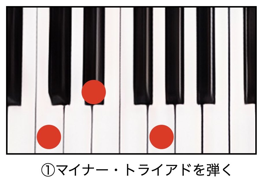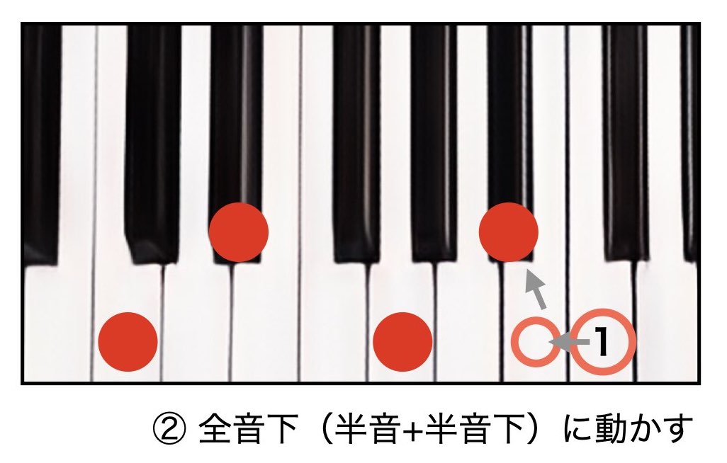 - 1オクターブ上のルートから全音下の音を弾く、またはメジャー・トライアド一番上(右)の音から3つ鍵盤を進める(間に2つ鍵盤が入っている状態)