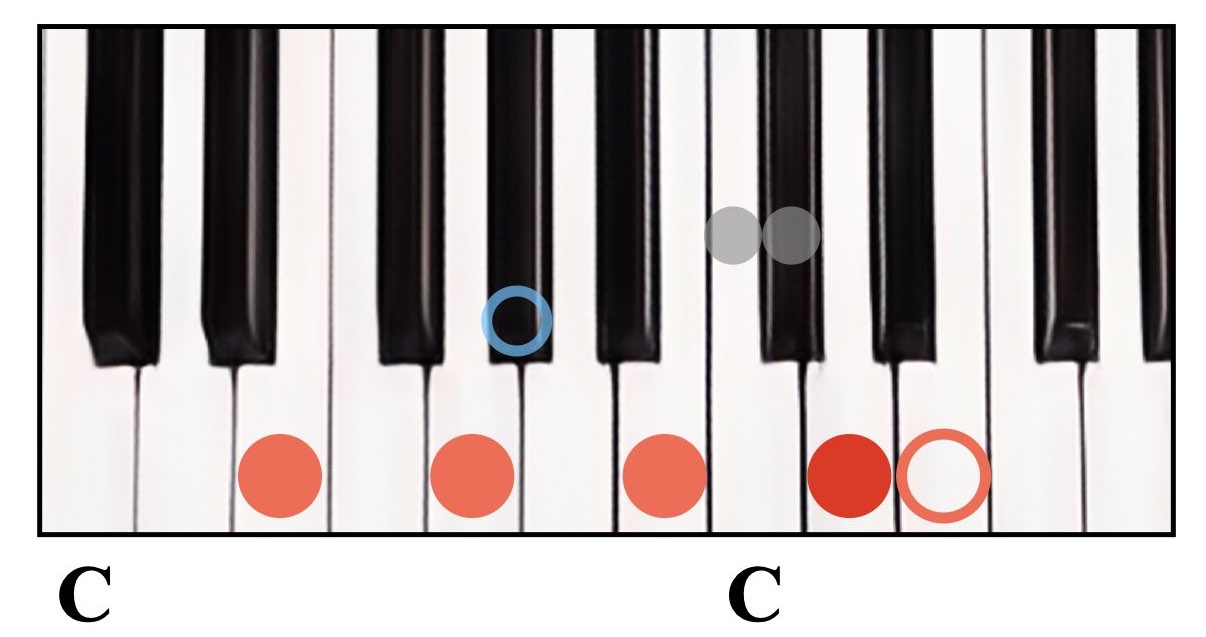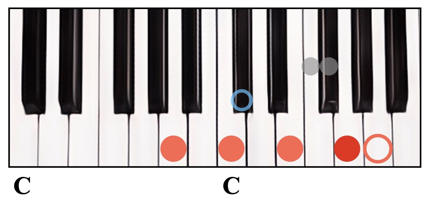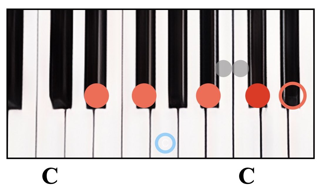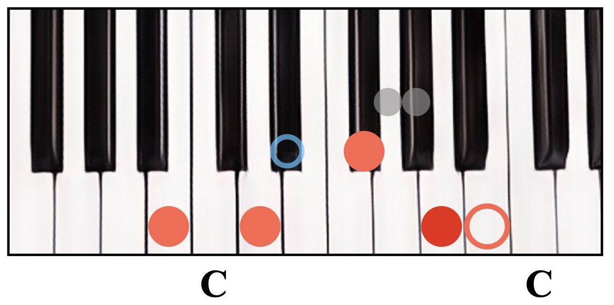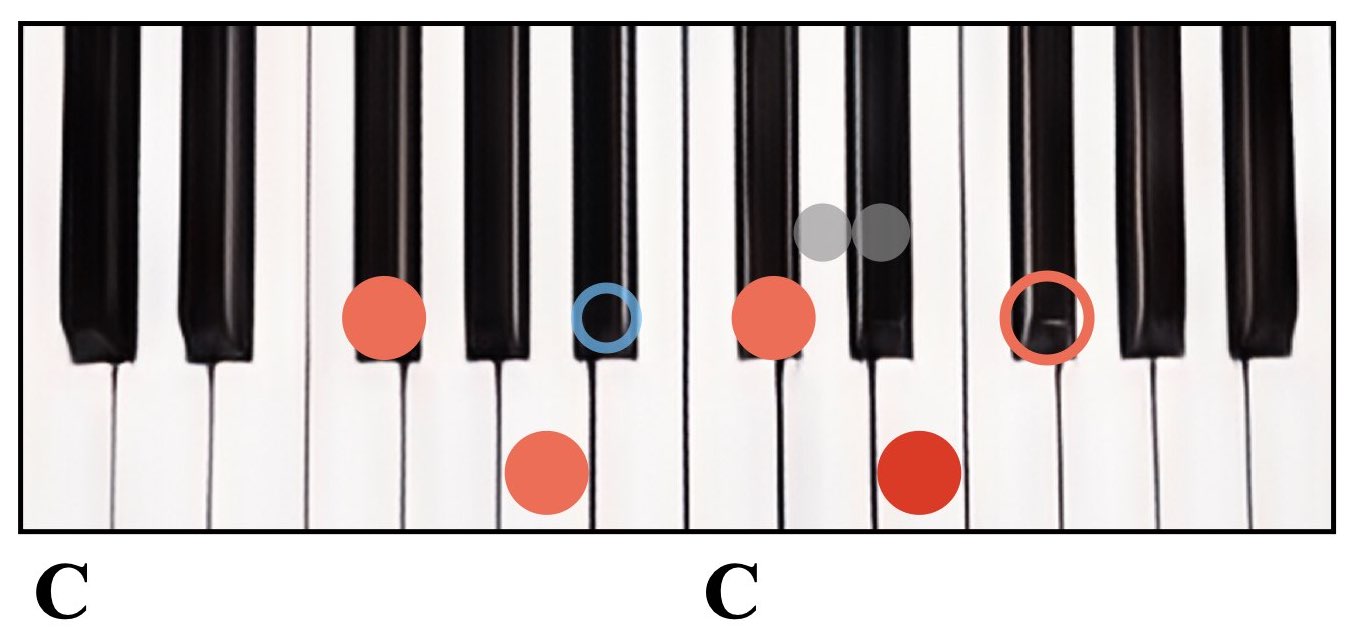 - 1オクターブ上のルートから全音下の音を弾く、またはメジャー・トライアド一番上(右)の音から3つ鍵盤を進める(間に2つ鍵盤が入っている状態)
