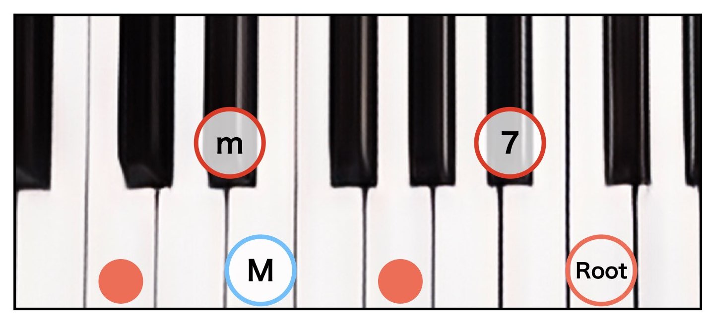 薄い赤丸 ● がメジャー・トライアド、赤丸 ● が m7の音です。