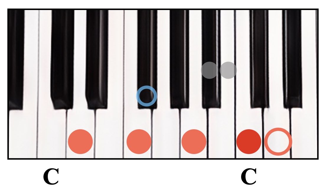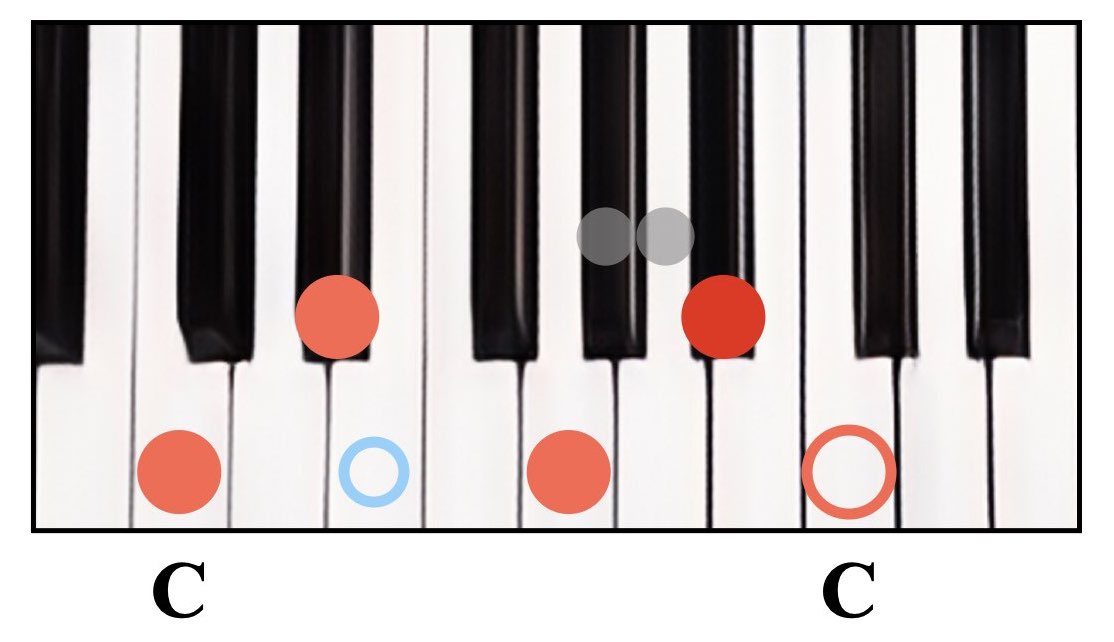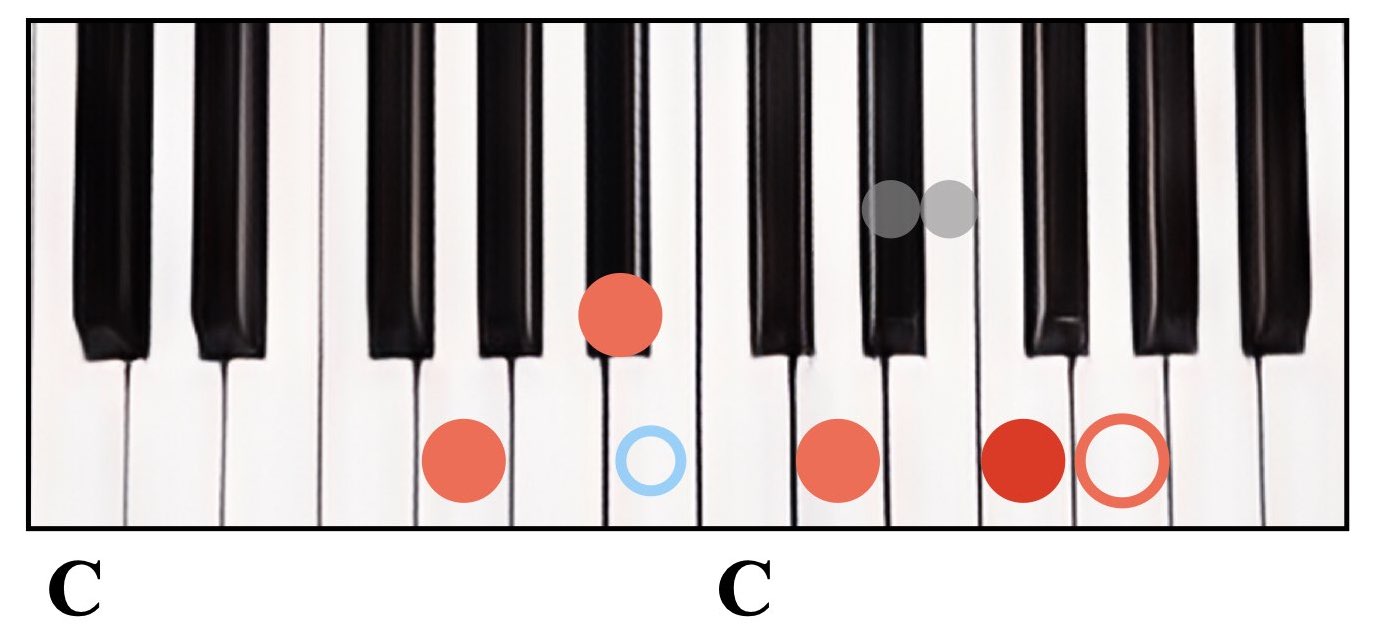 グレーの小さい丸 ● はメジャー・トライアドの上に1音足した時に間に入る3つ鍵盤を示しています。