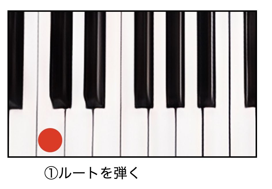 ①ルートを弾く(ルートはアファベットの大文字の音です。)