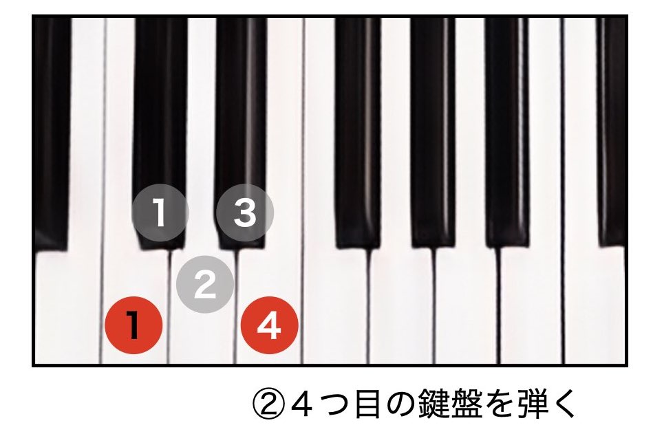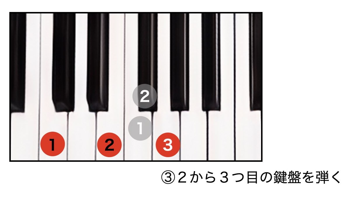 ③ ②の鍵盤から3つ鍵盤を進めて弾く(間に鍵盤が2つ入っている状態)