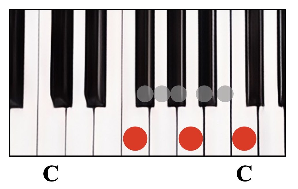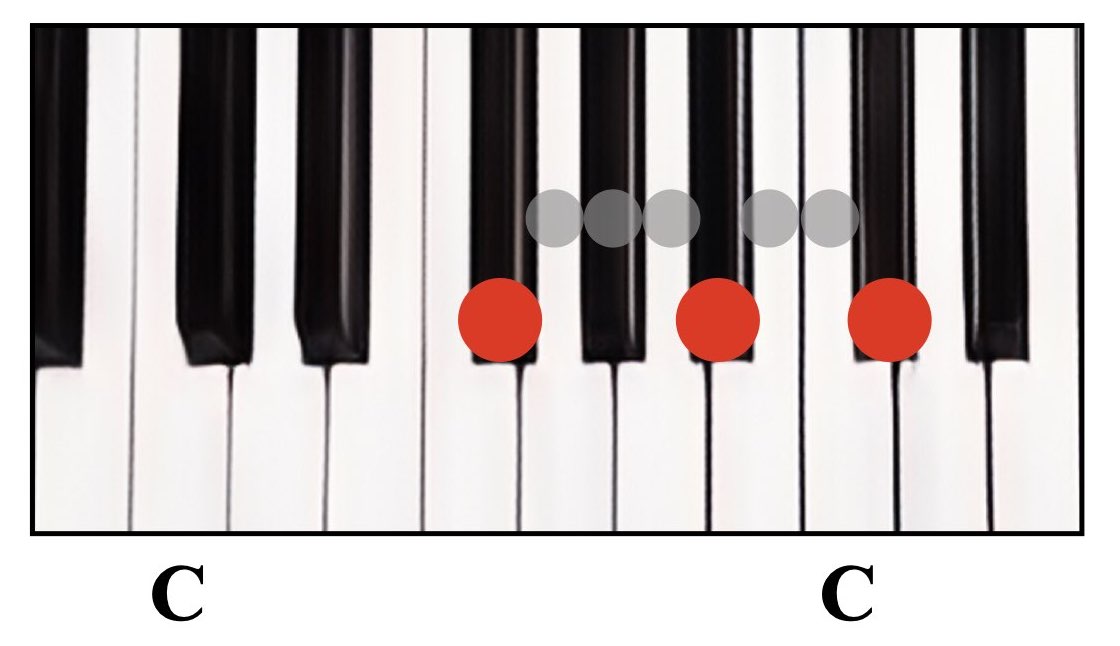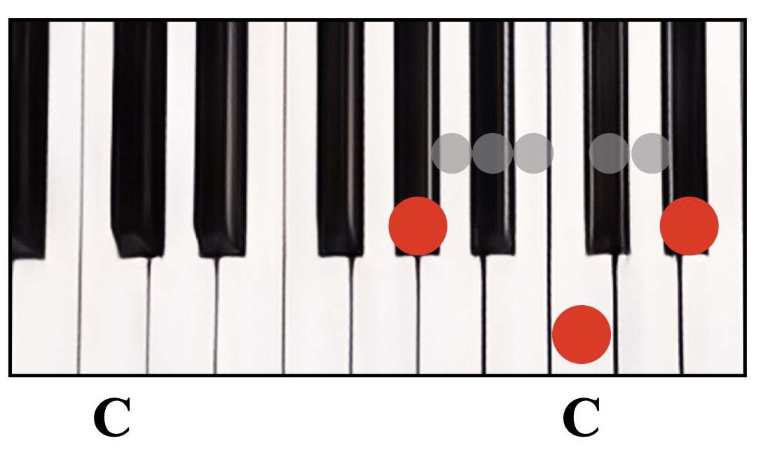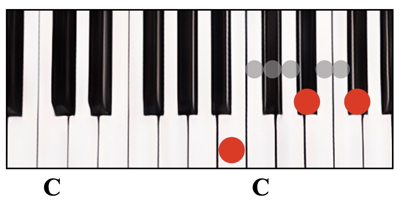 赤丸が弾く鍵盤で、グレーの丸は間に入る鍵盤数を示しています。