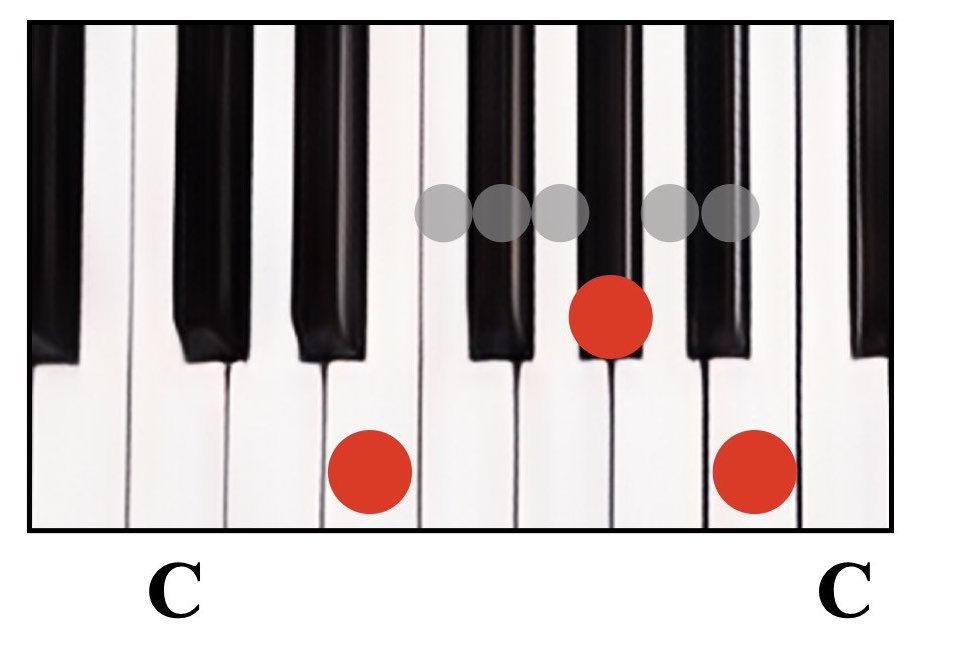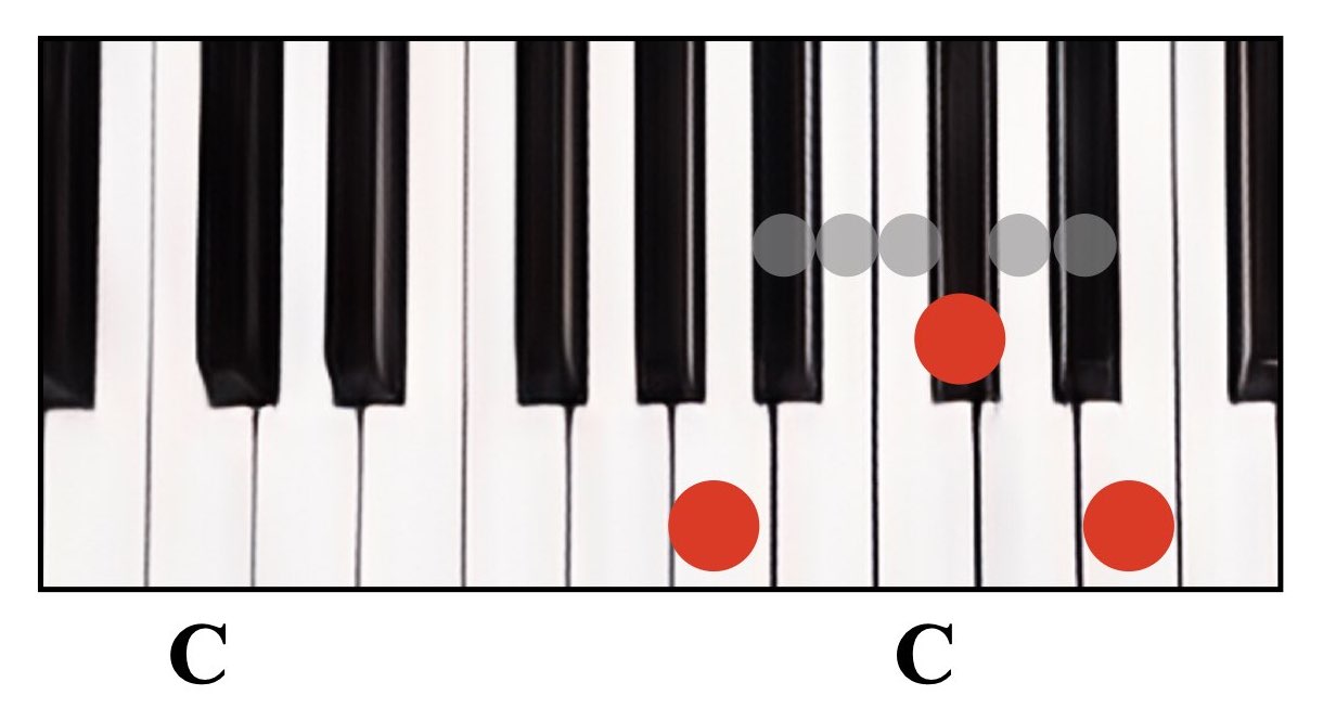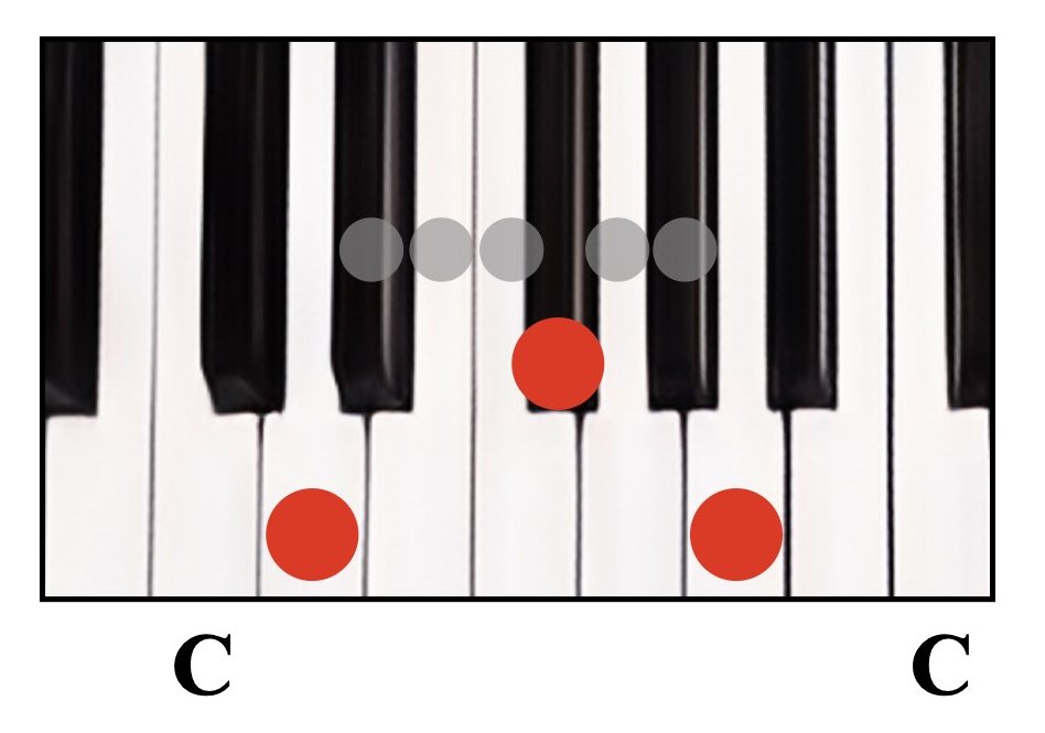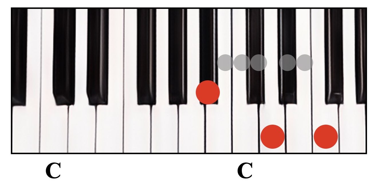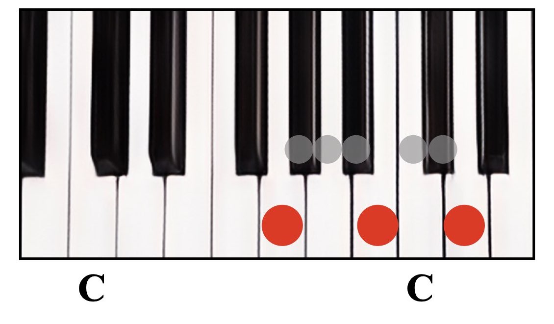 赤丸が弾く鍵盤で、グレーの丸は間に入る鍵盤数を示しています。