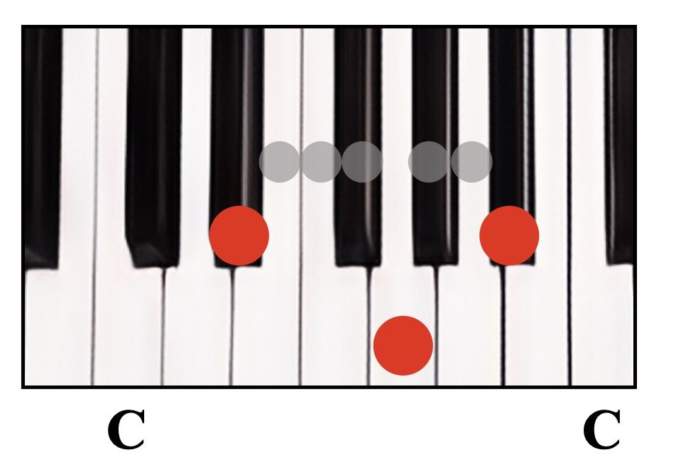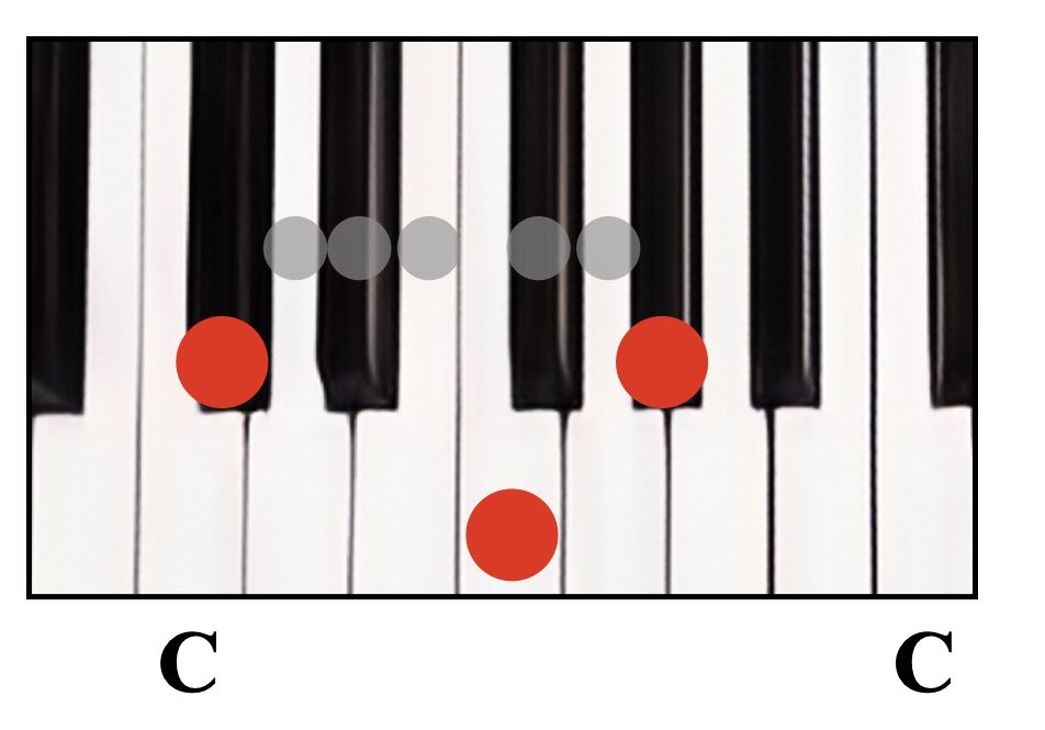 ②ルートから4つ鍵盤を進めて弾く(間に鍵盤が3つ入っている状態)