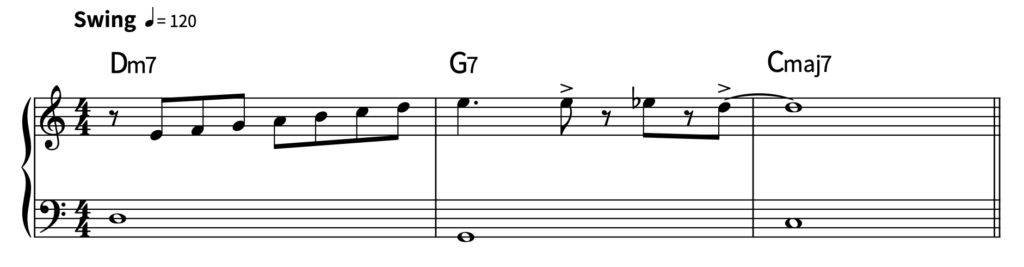 今回はその次のステップとして、簡単なフレーズを使って、実際にスウィングのリズムで弾く練習をしていきましょう。