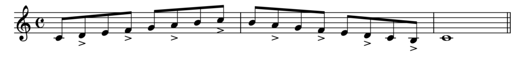 - Cメジャースケールを8分音符で弾くとき、1〜4拍目の裏にアクセントをつける
