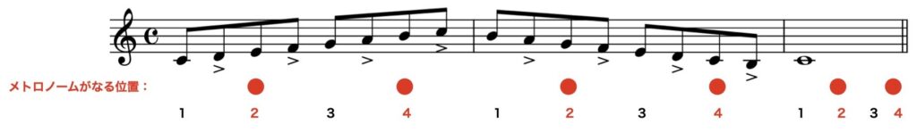 スケールの裏アクセントと、メトロノームが鳴る位置が異なるので、リズムがズレないように気をつけましょう。